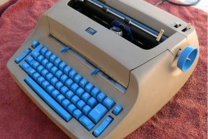 Comme l’indique le titre de ce post, je suis à la recherche d’une machine IBM Selectric première génération (1961-1971) ayant des touches bleues (voir photo) peu importe le « layout ».