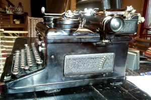 Le numéro de ma machine est : 90775. Je l’ai datée de 1929 en consultant le site The Typewriter Database. Mais je ne suis pas certain de ma conclusion. La qualité de l’impression sur cette machine est particulièrement belle, et le toucher léger et sûr. Malgré quelques éraflures sur la peinture, l’aspect extérieur est très beau. D’ailleurs, je ne déteste pas les marques de l’âge sur ces belles mécaniques.