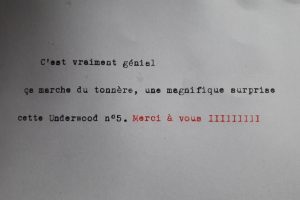 Personnellement je n’ai qu’une Underwood, réparée grâce à Mr Hoffer. ( échappement, vis, conseils, ressort compensateur de Majuscules etc.
