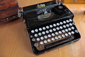 Malheureusement ma 5 ne possède pas de boîte (je l’ai trouvée comme ça). Mais je suis l’heureux possesseur d’une Erika M (version plus sophistiquée et plus carénée de la 5), esthétiquement très semblable à l’Erika 5. Je me suis permis d’ajouter (les puristes vont me fusiller !) une couleur rouge à son socle (voir photo), comme certains fabricants de machines l’ont fait. Ainsi je n’ai qu’à ôter le couvercle pour m’en servir, comme pour beaucoup de portatives, sans que mon regard en pâtisse !